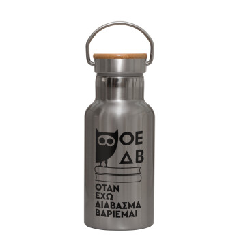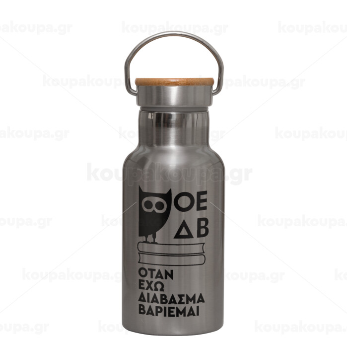ΟΕΔΒ, Stainless steel metallic thermos flask, silver with a bamboo lid, double-walled, 350ml.