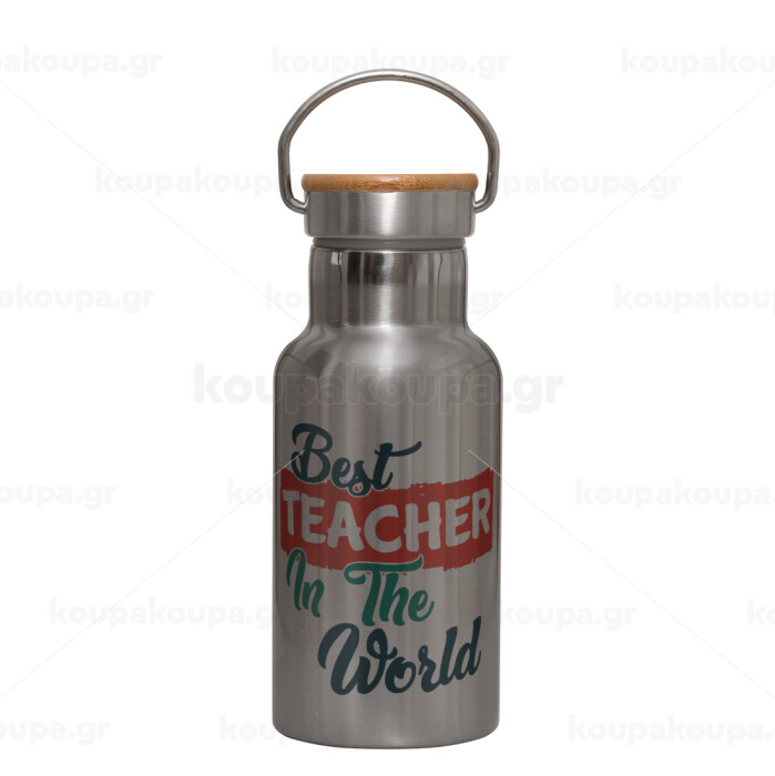 Best teacher in the World!, Stainless steel metallic thermos flask, silver with a bamboo lid, double-walled, 350ml.