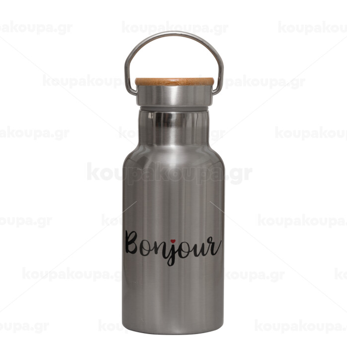 Bonjour, Stainless steel metallic thermos flask, silver with a bamboo lid, double-walled, 350ml.