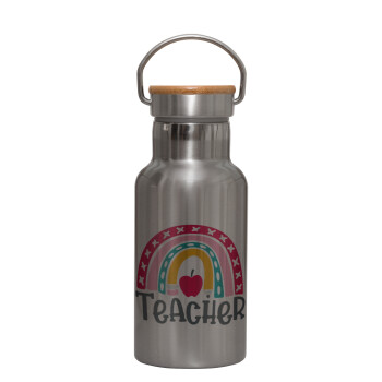 Rainbow teacher, Stainless steel metallic thermos flask, silver with a bamboo lid, double-walled, 350ml.