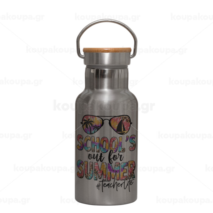 School's Out For Summer Teacher Life, Stainless steel metallic thermos flask, silver with a bamboo lid, double-walled, 350ml.
