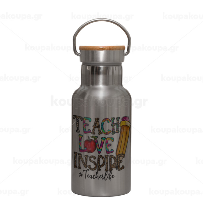 Teach, Love, Inspire, Stainless steel metallic thermos flask, silver with a bamboo lid, double-walled, 350ml.