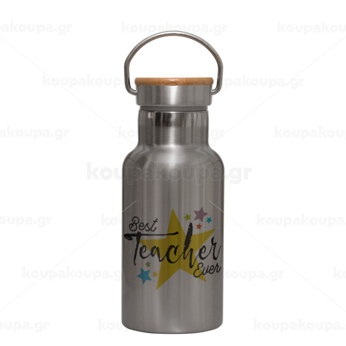 Teacher super star!!!, Stainless steel metallic thermos flask, silver with a bamboo lid, double-walled, 350ml.