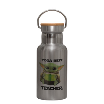 Yoda Best Teacher, Stainless steel metallic thermos flask, silver with a bamboo lid, double-walled, 350ml.