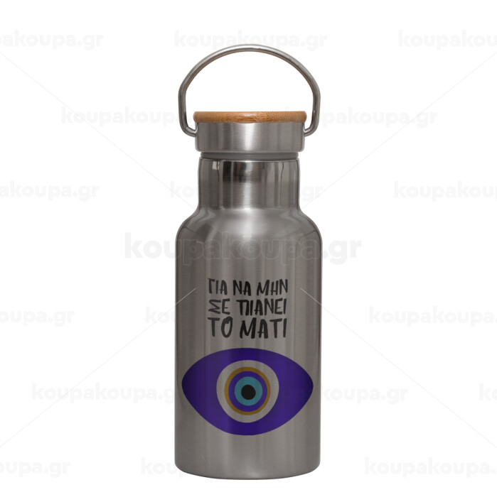Για να μην σε πιάνει το μάτι, Stainless steel metallic thermos flask, silver with a bamboo lid, double-walled, 350ml.