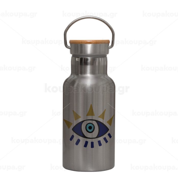 blue evil eye, Stainless steel metallic thermos flask, silver with a bamboo lid, double-walled, 350ml.