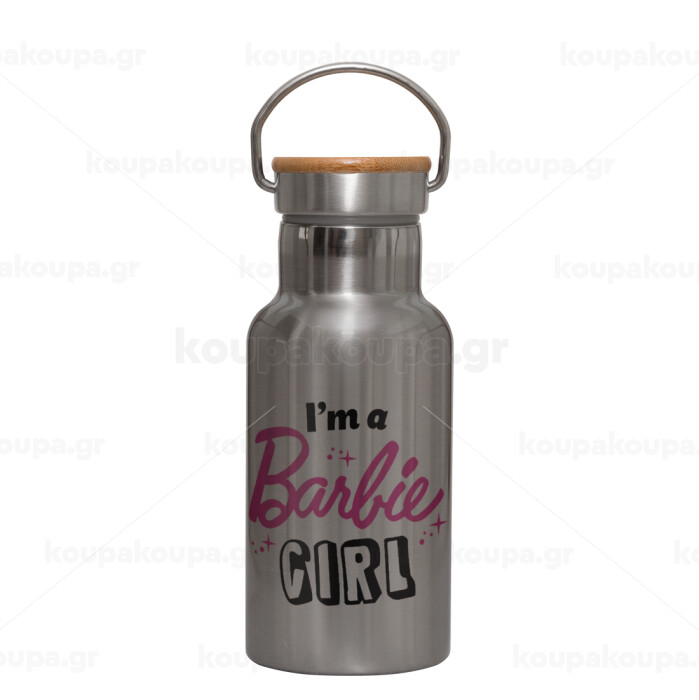 I'm Barbie girl, Stainless steel metallic thermos flask, silver with a bamboo lid, double-walled, 350ml.