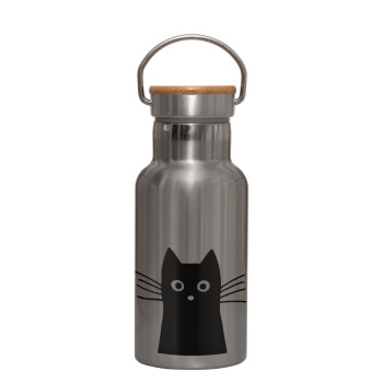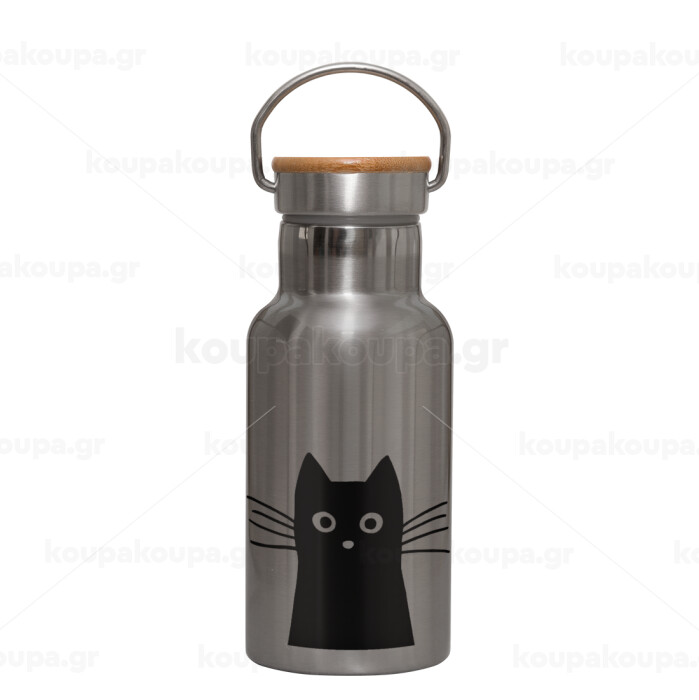 Black Cat, Stainless steel metallic thermos flask, silver with a bamboo lid, double-walled, 350ml.
