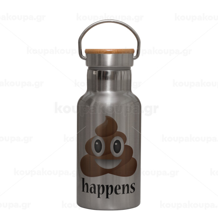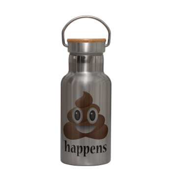 Shit Happens, Stainless steel metallic thermos flask, silver with a bamboo lid, double-walled, 350ml.