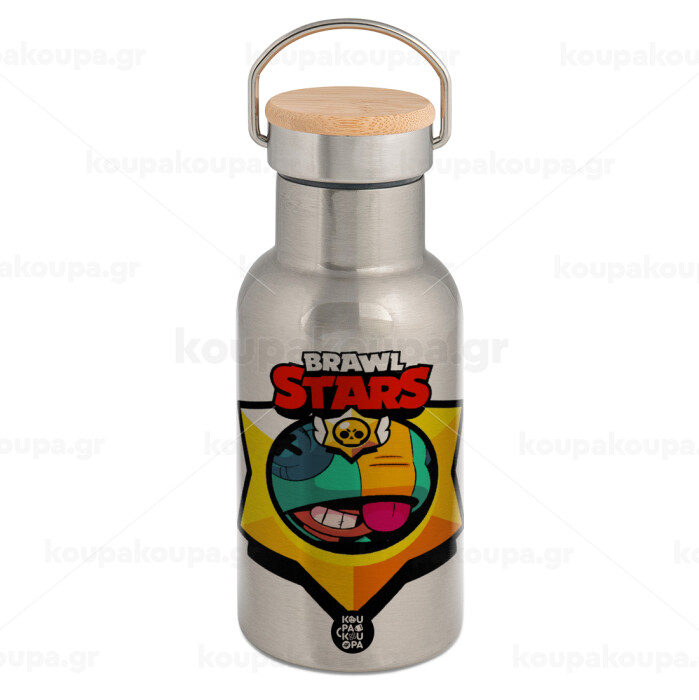 Brawl Stars Leon, Stainless steel metallic thermos flask, silver with a bamboo lid, double-walled, 350ml.
