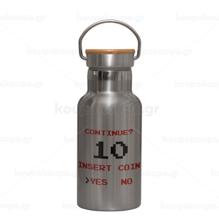 Continue? YES - NO, Stainless steel metallic thermos flask, silver with a bamboo lid, double-walled, 350ml.