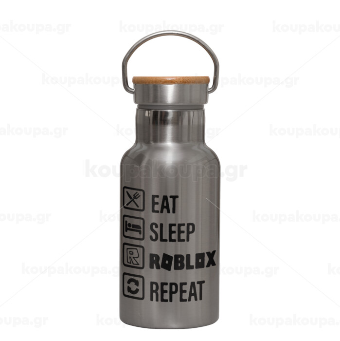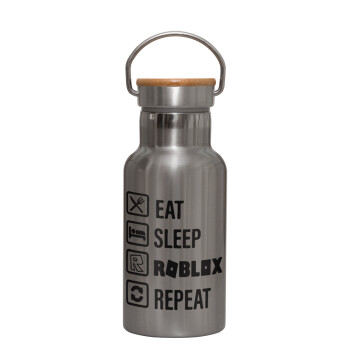 Eat, Sleep, Roblox, Repeat, Stainless steel metallic thermos flask, silver with a bamboo lid, double-walled, 350ml.