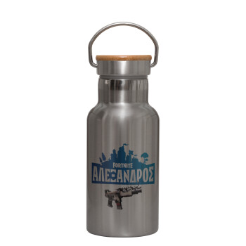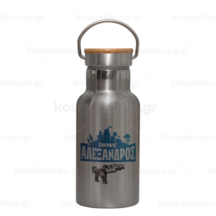 Fortnite with gun με το όνομα σου, Stainless steel metallic thermos flask, silver with a bamboo lid, double-walled, 350ml.