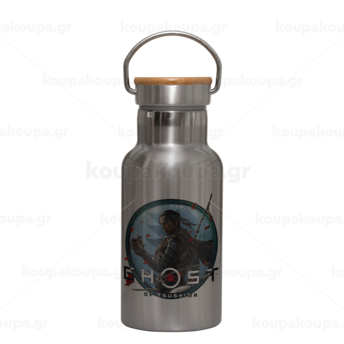 Ghost of Tsushima, Stainless steel metallic thermos flask, silver with a bamboo lid, double-walled, 350ml.