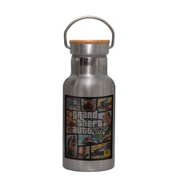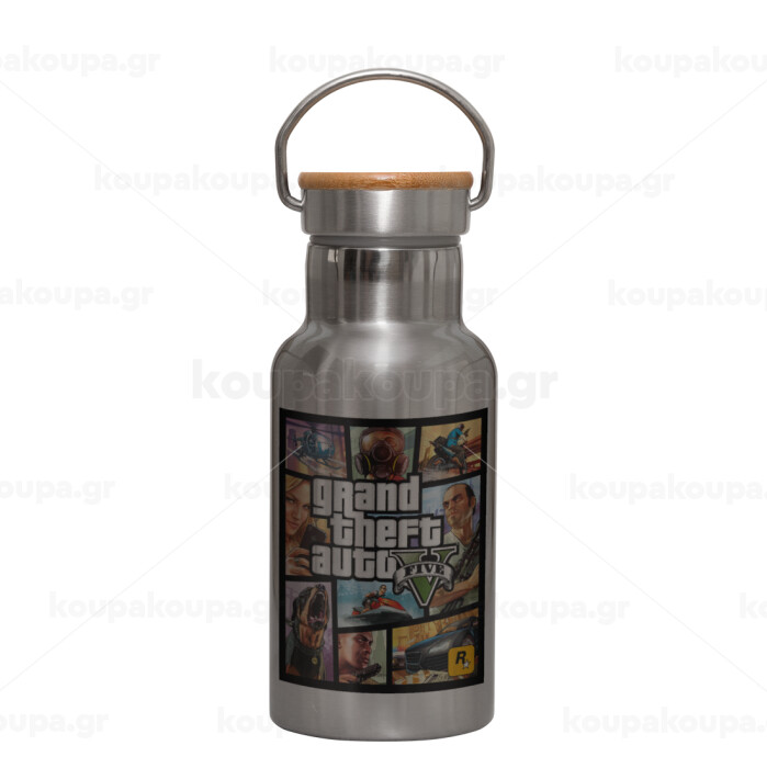 GTA V, Stainless steel metallic thermos flask, silver with a bamboo lid, double-walled, 350ml.