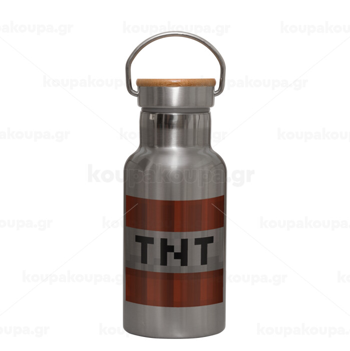 Minecraft TNT, Stainless steel metallic thermos flask, silver with a bamboo lid, double-walled, 350ml.
