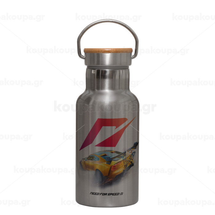 Need For Speed, Stainless steel metallic thermos flask, silver with a bamboo lid, double-walled, 350ml.