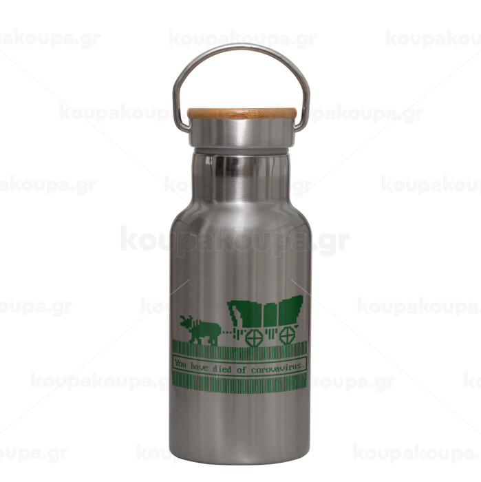 Oregon Trail, cov... edition, Stainless steel metallic thermos flask, silver with a bamboo lid, double-walled, 350ml.