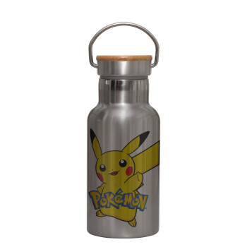 Pokemon pikachu, Stainless steel metallic thermos flask, silver with a bamboo lid, double-walled, 350ml.