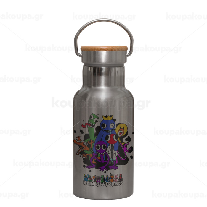 Rainbow friends, Stainless steel metallic thermos flask, silver with a bamboo lid, double-walled, 350ml.
