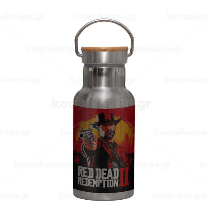 Red Dead Redemption 2, Stainless steel metallic thermos flask, silver with a bamboo lid, double-walled, 350ml.