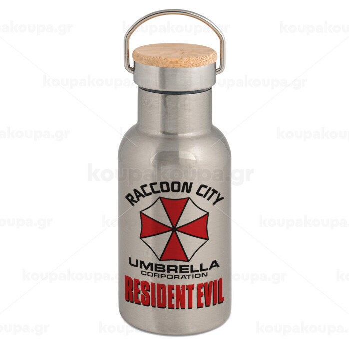 Resident Evil, Stainless steel metallic thermos flask, silver with a bamboo lid, double-walled, 350ml.