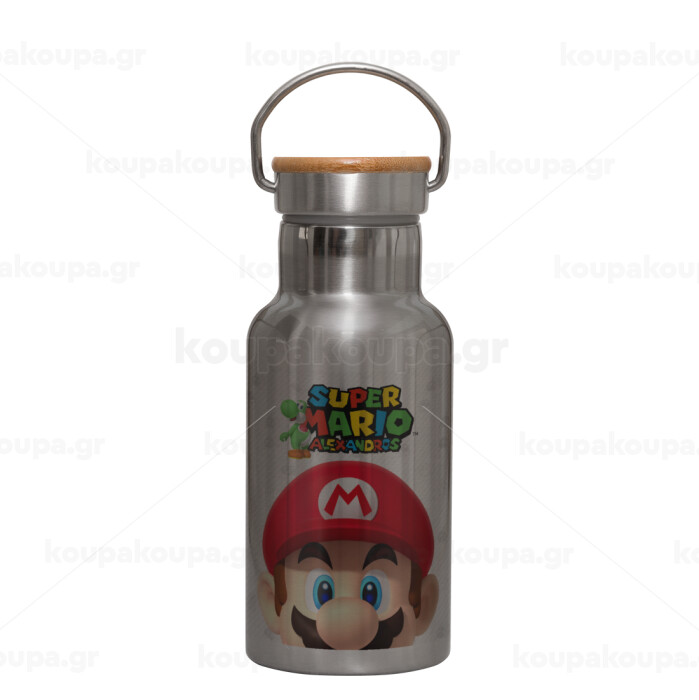 Super mario head, Stainless steel metallic thermos flask, silver with a bamboo lid, double-walled, 350ml.