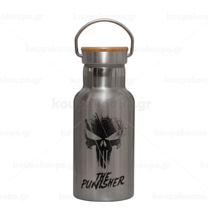 The punisher, Stainless steel metallic thermos flask, silver with a bamboo lid, double-walled, 350ml.