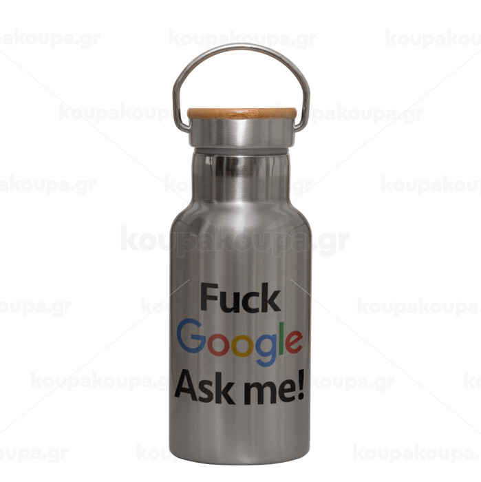 Fuck Google, Ask me!, Stainless steel metallic thermos flask, silver with a bamboo lid, double-walled, 350ml.