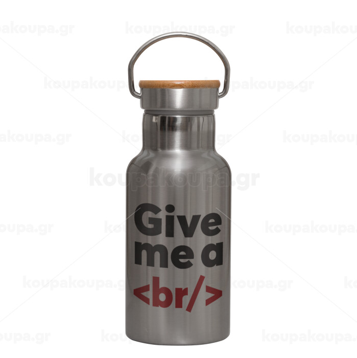 , Stainless steel metallic thermos flask, silver with a bamboo lid, double-walled, 350ml.