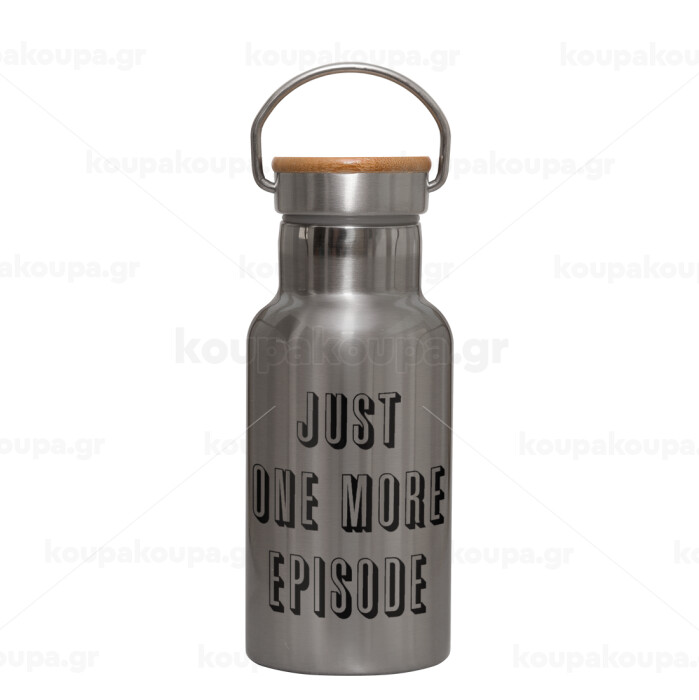 JUST ONE MORE EPISODE, Stainless steel metallic thermos flask, silver with a bamboo lid, double-walled, 350ml.