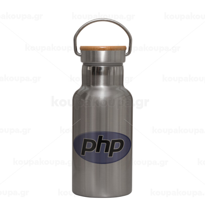 PHP, Stainless steel metallic thermos flask, silver with a bamboo lid, double-walled, 350ml.