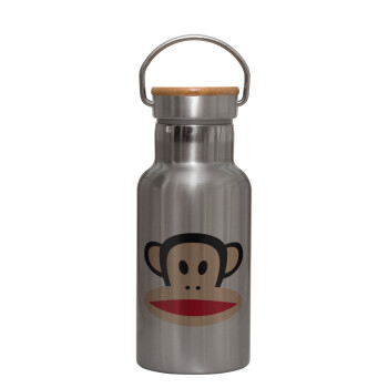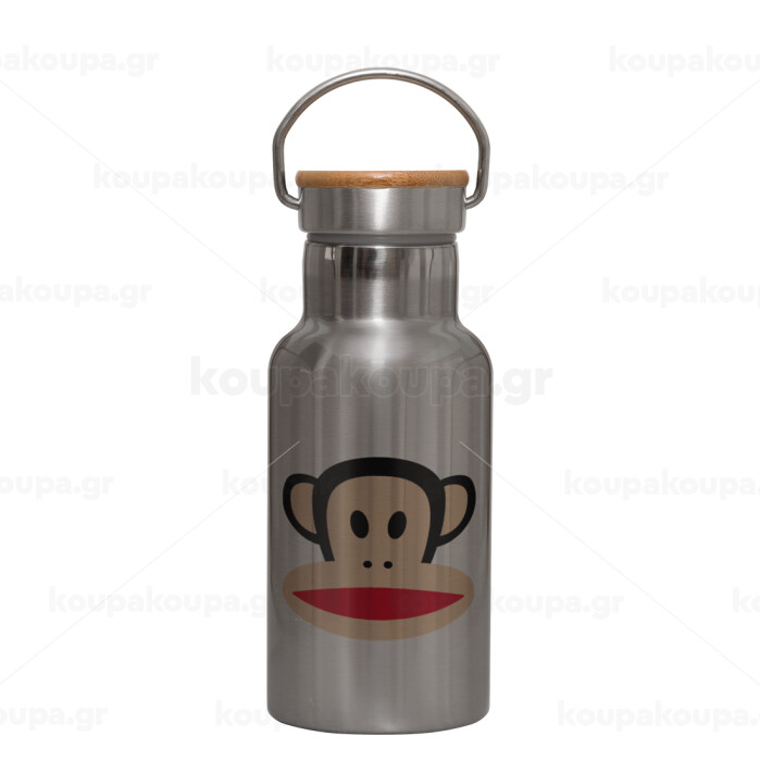 Monkey, Stainless steel metallic thermos flask, silver with a bamboo lid, double-walled, 350ml.
