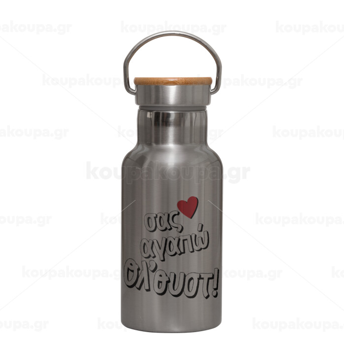 Σας αγαπώ όλ'ουστ!, Stainless steel metallic thermos flask, silver with a bamboo lid, double-walled, 350ml.