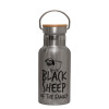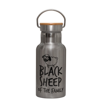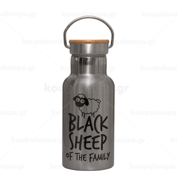 Black Sheep of the Family, Stainless steel metallic thermos flask, silver with a bamboo lid, double-walled, 350ml.