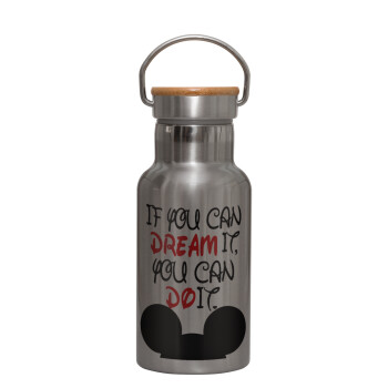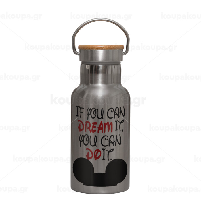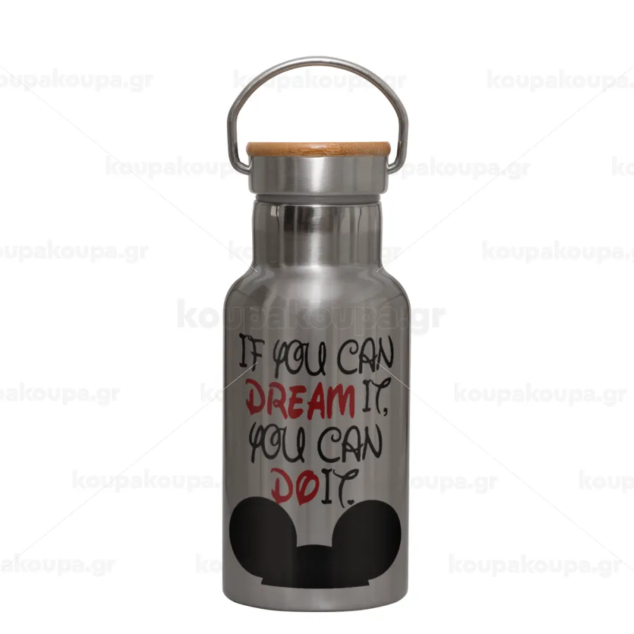 If you can dream it, you can do it, Stainless steel metallic thermos flask, silver with a bamboo lid, double-walled, 350ml.