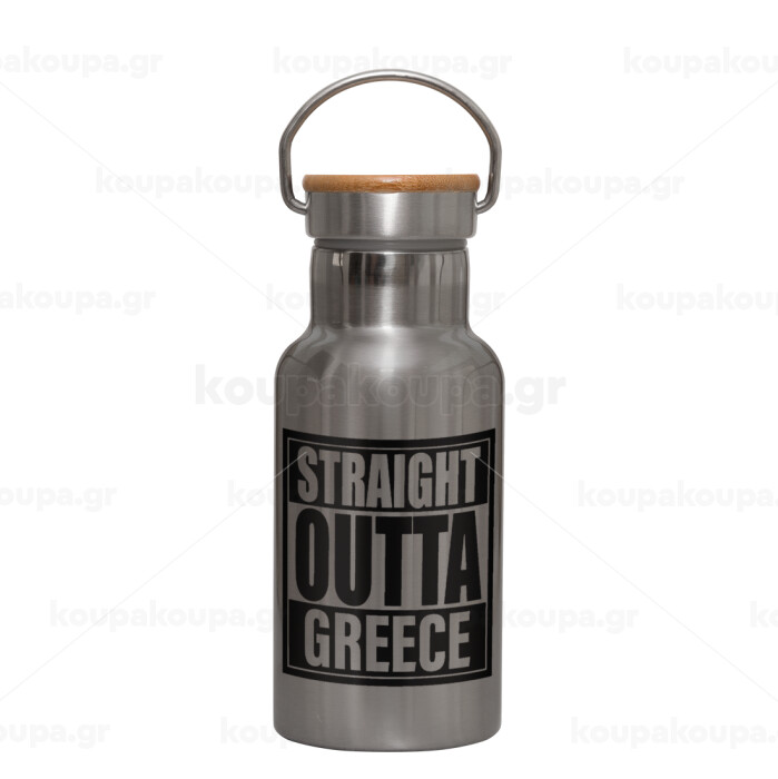 Straight Outta greece, Stainless steel metallic thermos flask, silver with a bamboo lid, double-walled, 350ml.