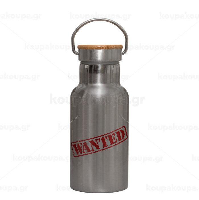 Wanted, Stainless steel metallic thermos flask, silver with a bamboo lid, double-walled, 350ml.