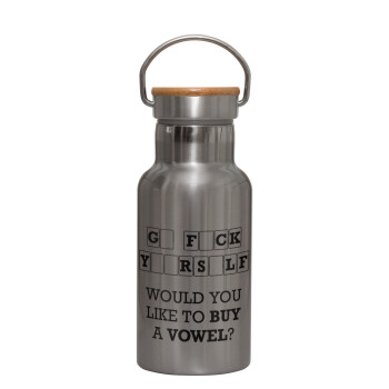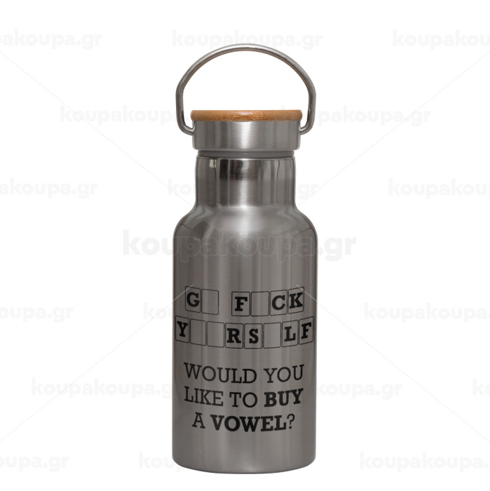 Wheel of fortune, go f..k yourself, Stainless steel metallic thermos flask, silver with a bamboo lid, double-walled, 350ml.