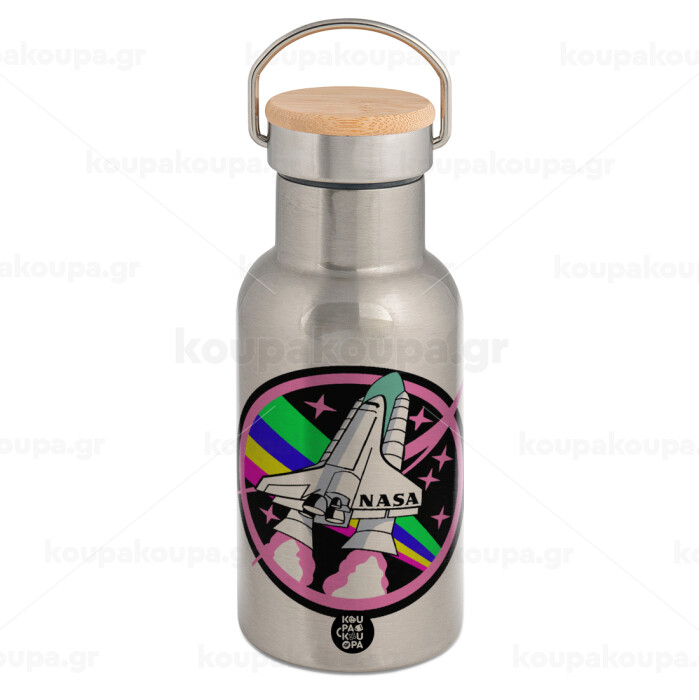 NASA pink, Stainless steel metallic thermos flask, silver with a bamboo lid, double-walled, 350ml.