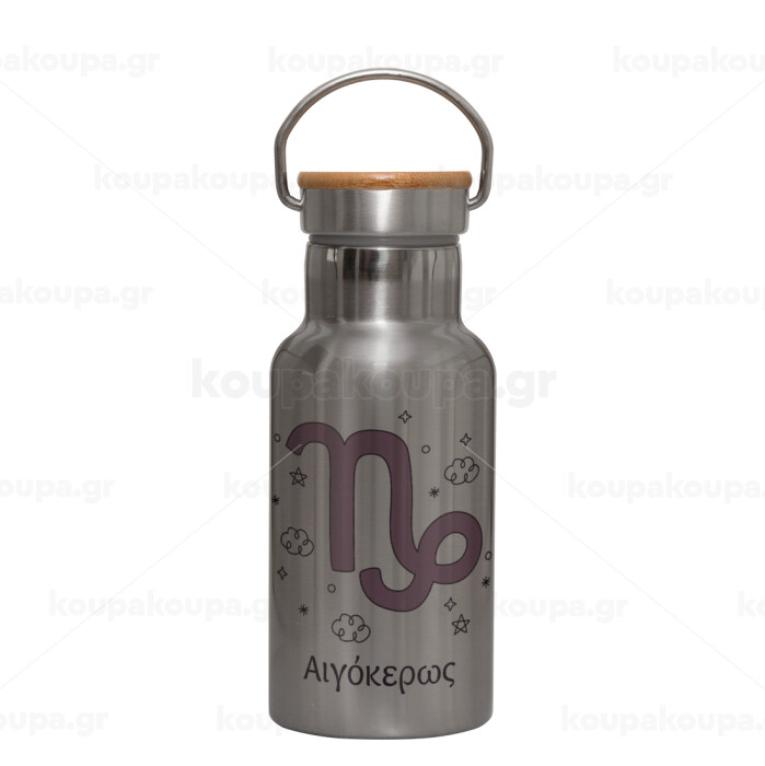 Ζώδια Αιγόκερως, Stainless steel metallic thermos flask, silver with a bamboo lid, double-walled, 350ml.