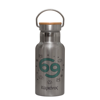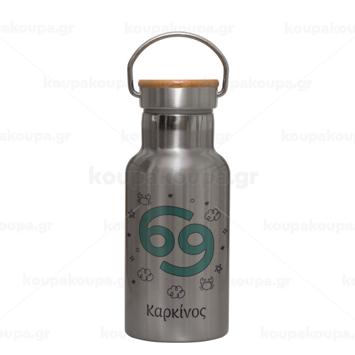Ζώδια Καρκίνος, Stainless steel metallic thermos flask, silver with a bamboo lid, double-walled, 350ml.
