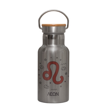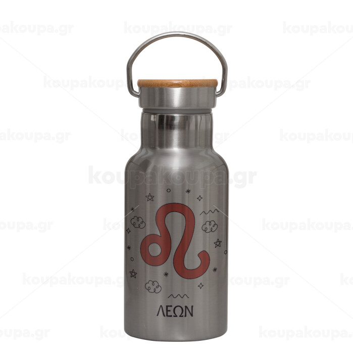 Ζώδια Λέων, Stainless steel metallic thermos flask, silver with a bamboo lid, double-walled, 350ml.
