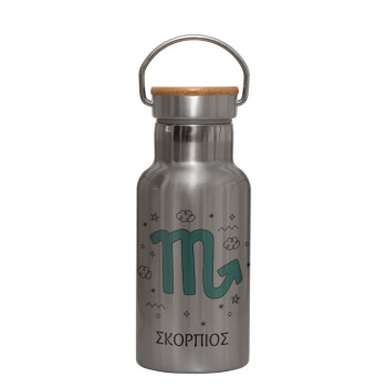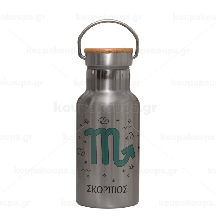 Ζώδια Σκορπιός, Stainless steel metallic thermos flask, silver with a bamboo lid, double-walled, 350ml.