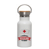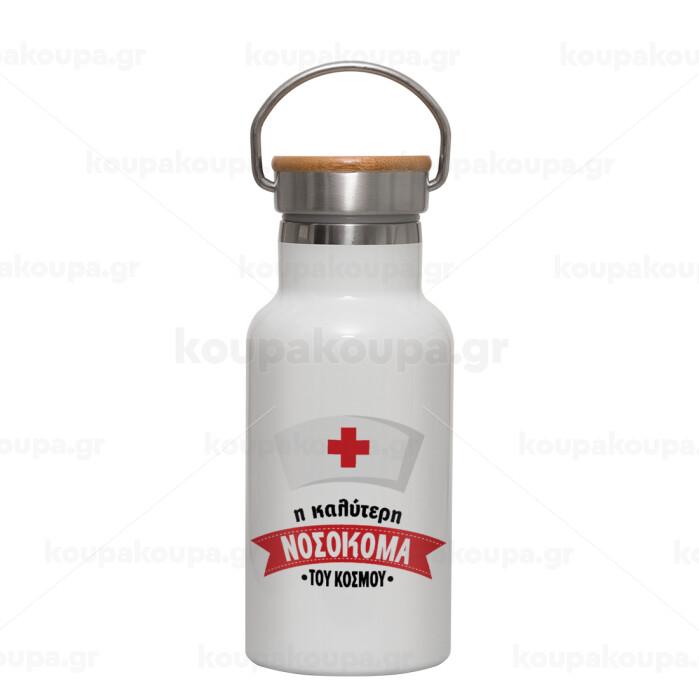 Η καλύτερη νοσοκόμα του κόσμου!!!, Metallic thermos (Stainless steel) White with wooden lid (bamboo), double-walled, 350ml
