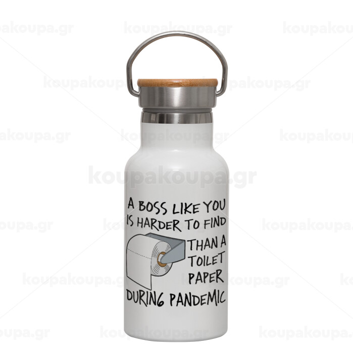 A boss like you is harder to find, than a toilet paper during pandemic, Metallic thermos (Stainless steel) White with wooden lid (bamboo), double-walled, 350ml