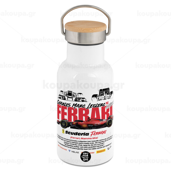 F1 Ferrari, Metallic thermos (Stainless steel) White with wooden lid (bamboo), double-walled, 350ml