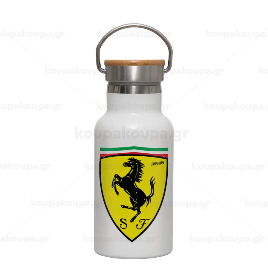 Ferrari, Metallic thermos (Stainless steel) White with wooden lid (bamboo), double-walled, 350ml