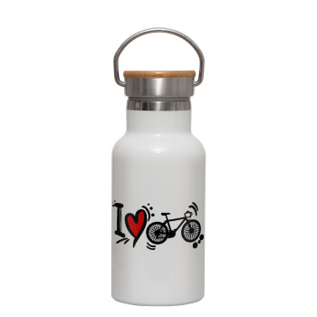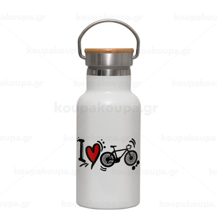 I love my bike, Metallic thermos (Stainless steel) White with wooden lid (bamboo), double-walled, 350ml