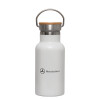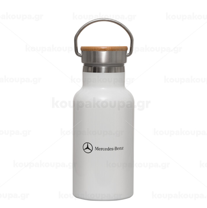 Mercedes small logo, Metallic thermos (Stainless steel) White with wooden lid (bamboo), double-walled, 350ml
